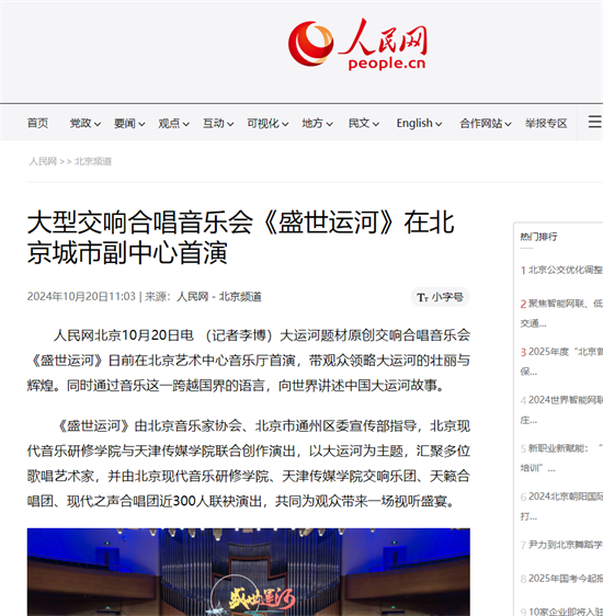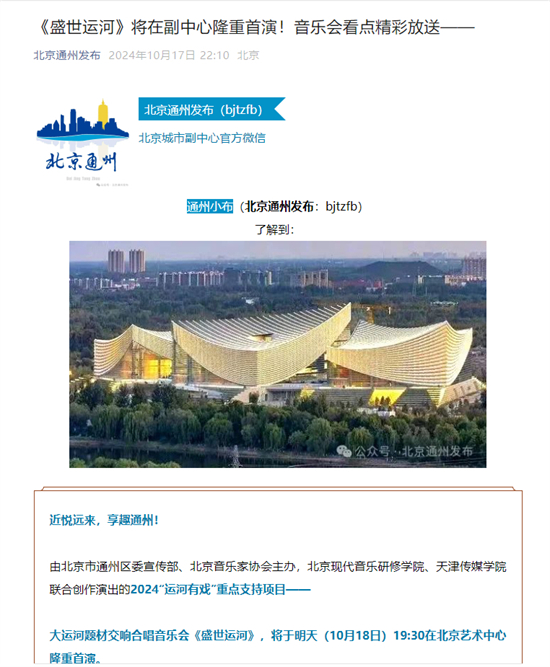 10月18日晚,由北京音乐家协会、中共北京市通州区委宣传部指导,北京现代音乐研修学院与188BET金宝搏安卓下载联合创作演出的2024“运河有戏”重点支持项目——大运河题材原创交响合唱音乐会《盛世运河》在北京艺术中心·音乐厅盛大首演。