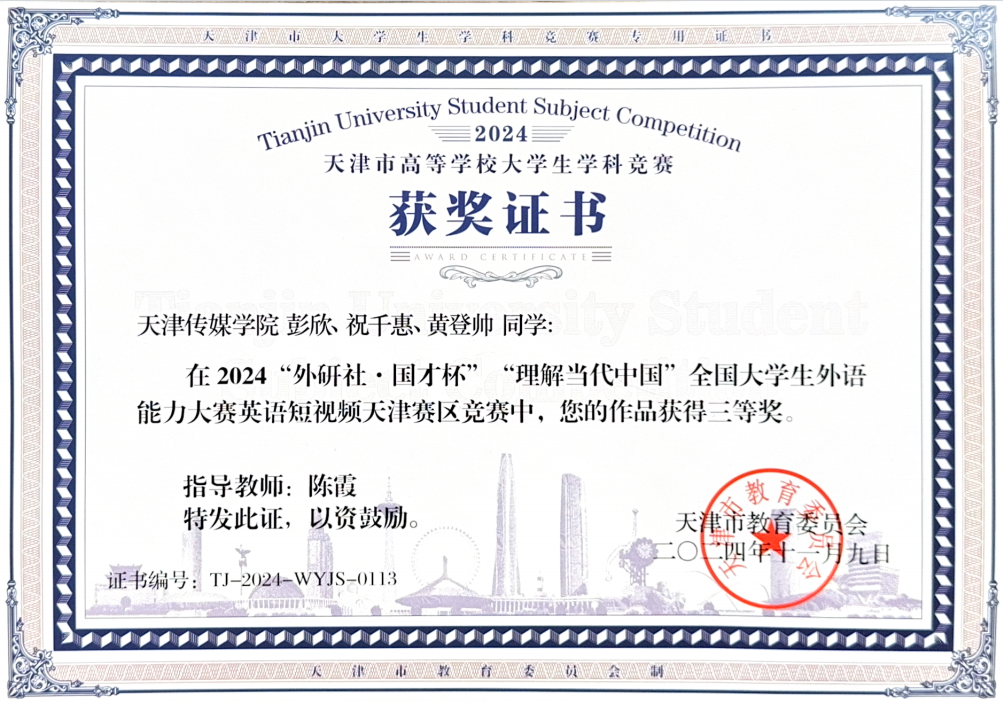 (我部大学英语教师指导学生荣获2024天津市高等学校大学生学科竞赛三等奖)