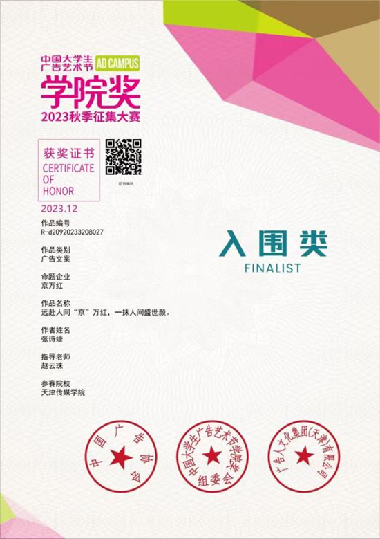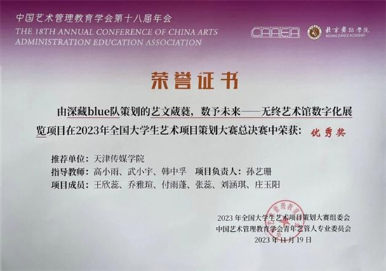 我系王欣蕊、乔雅瑄、付雨蓬、张蕊、刘涵琪、庄玉阳同学策划的“艺文葳蕤,数予未来”数字化展览项目荣获优秀奖,指导教师武小宇、高小雨、韩中孚在本次策划案大赛中获优秀指导教师奖。