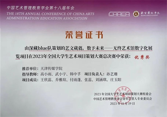 在各位老师的辛勤教导与同学们的团结协作下,我系学子策划的“艺文葳蕤,数予未来”数字化展览项目在2023全国大学生艺术项目策划大赛总决赛中荣获优秀奖。该项目的指导教师武小宇、高小雨、韩中孚在本次策划案大赛中获优秀指导教师奖。