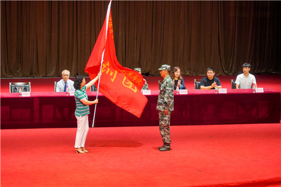常务副校长李晓华宣布成立军训团的命令,伴随着热烈的掌声,陈红副校长将军训团团旗授予承训团团长乔建生。