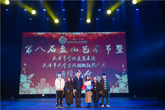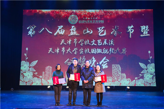 2018年12月13日18:00,第八届盘山艺术节闭幕式暨天津市学校文艺展演获奖作品、第八届天津市大学生校园微视频大赛颁奖晚会于天艺大讲堂举行。莅临晚会现场的领导有北京现代艺术传媒教育集团董事长、天津体育学院运动与文化艺术学院校长李罡,常务副校长李晓华,党委书记李涛,集团演艺公司总经理孙羽郎,副校长尹庆民、李元、陈红、马斌,各二级学院院长、各科室、北音盘山校区、中专校的各位领导。晚会现场为在天津市学校文艺展演及第八届天津市大学生校园微视频大赛中获奖的作品及指导教师颁奖。