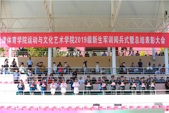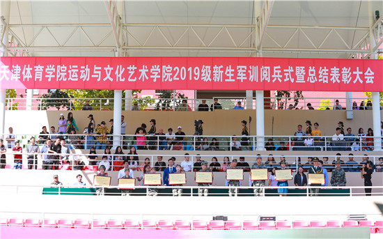 壮阔七十年,奋进新时代。为增强天艺学子国防意识,激发爱国热情,2019年9月16日,我校2019级新生军训阅兵式暨总结表彰大会在奥林匹克运动场隆重举行。校长李罡、常务副校长李晓华,党委书记李涛,副校长尹庆民、陈红、马斌,天津市津彩青少年素质教育服务中心军训团团长乔建生、副团长李景宇,各二级学院院长、副院长,以及各职能处室主要领导出席本次军训阅兵仪式。