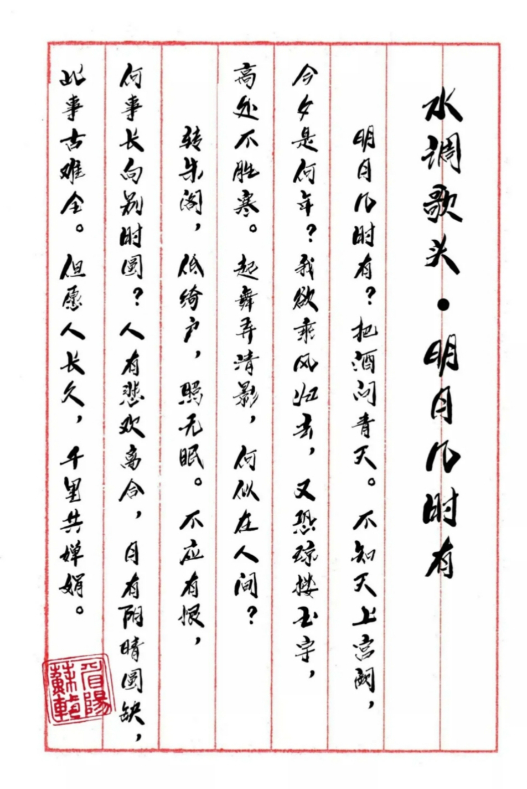明月几时有?把酒问青天。不知天上宫阙,今夕是何年。我欲乘风归去,又恐琼楼玉宇,高处不胜寒。起舞弄清影,何似在人间?