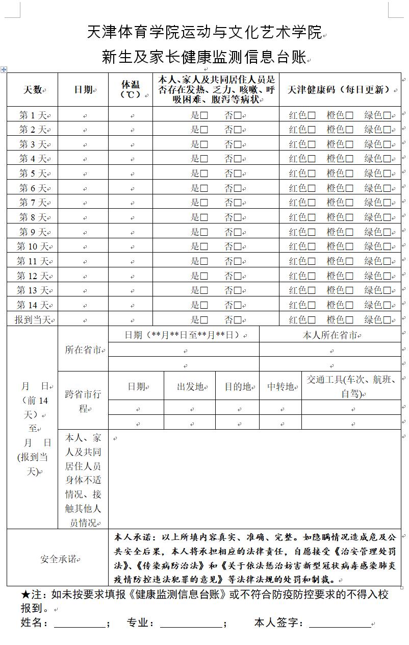 所有新生及陪同入校的家长在报到前14天进行日常体温测量和身体健康状况监测,做到每天体温测量并记录,如实填写《天津体育学院运动与文化艺术学院新生及家长健康监测信息台账》(简称《健康监测信息台账》)。未提供《健康监测信息台账》的新生及家长,将不能入校。新生及家长不如实填报、不配合开展卫生防疫工作或隐瞒、谎报等情形,造成严重后果的,将依法追究责任。